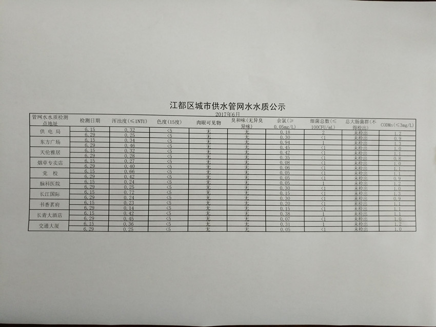 2017年6月江都區(qū)城市供水管網(wǎng)水水質(zhì)公示
