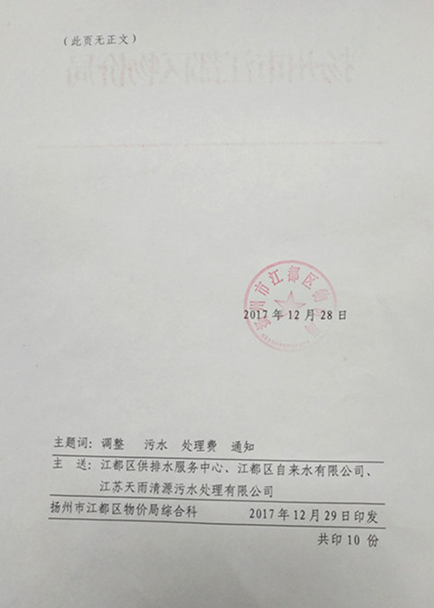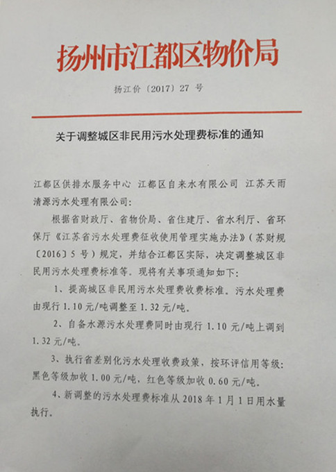 區(qū)物價(jià)局《關(guān)于調(diào)整城區(qū)非民用污水處理費(fèi)標(biāo)準(zhǔn)的通知》