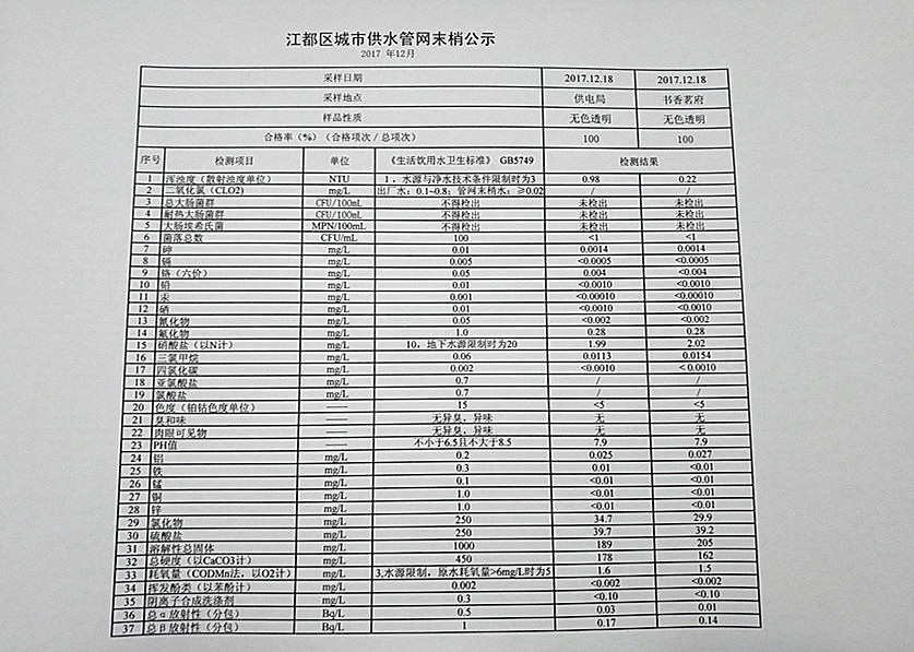 2017年12月江都區(qū)城市供水管網(wǎng)末梢公示