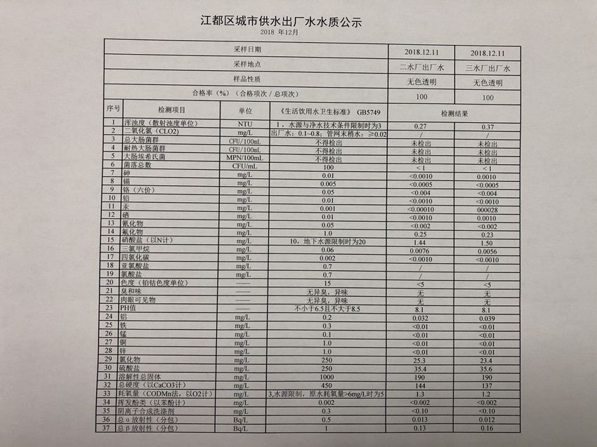 2018年12月江都區(qū)城市供水出廠水水質(zhì)公示