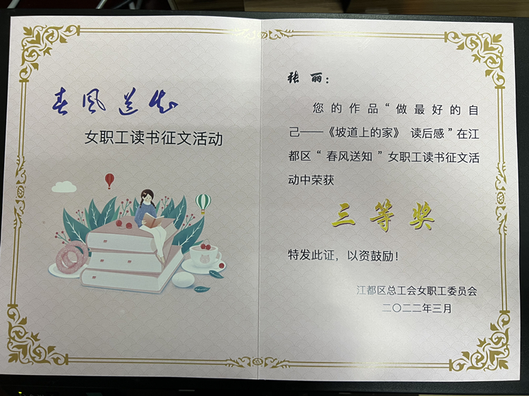 為全面提升員工綜合素質(zhì),倡導(dǎo)終身學(xué)習(xí)理念,豐富精神生活,引領(lǐng)職業(yè)女性愛上閱讀,培養(yǎng)閱讀習(xí)慣,在閱讀中獲得幸福感,激勵(lì)女職工立足崗位,以最美的奮斗姿態(tài)砥礪前行。為此龍川水務(wù)公司除在內(nèi)部多形式的開展讀書比賽和讀書分享會(huì)等相關(guān)活動(dòng)之外,還積極響應(yīng)上級(jí)讀書征文活動(dòng)號(hào)召,鼓勵(lì)大家踴躍投稿參賽。日前,在揚(yáng)州市江都區(qū)總工會(huì)開展的“春風(fēng)送知”女職工讀書征文活動(dòng)中,由龍川水務(wù)公司選送的人力資源部張麗的參賽作品“做最好的自己—《坡道上的家》讀后感”獲得了三等獎(jiǎng)。