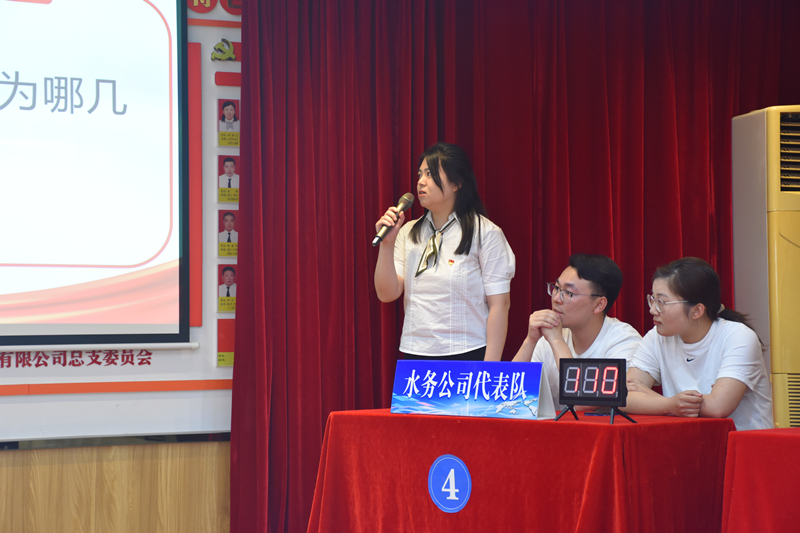 此次比賽分為小組共答題、個人必答題、搶答題、你劃我猜、風(fēng)險題五種形式,并分五輪進(jìn)行。共有五支代表隊參賽,分別是惠民、自來水、龍泉、水務(wù)、污水公司代表隊,且每個代表隊人員都是經(jīng)過層層篩選脫穎而出的。大家顯然是有備而來的,競賽過程精彩激烈,參賽選手們有的運(yùn)籌帷幄、有的胸有成竹、有的應(yīng)對自如,各代表隊你追我趕、搶答器的聲音此起彼伏,現(xiàn)場戰(zhàn)況異常激烈,展示出了新時代水務(wù)公司團(tuán)員青年的風(fēng)采。