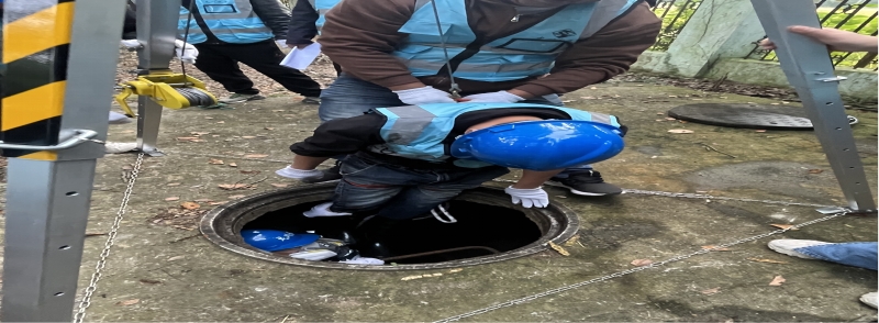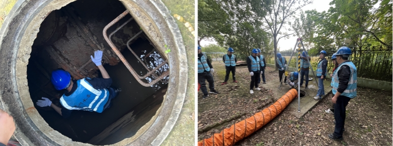 隨著演練正式開始,演練人員在閥門井口發(fā)現(xiàn)有人違規(guī)操作,入井倒地。指揮組接到匯報(bào),命令啟動(dòng)有限空間應(yīng)急搶修預(yù)案,并趕往現(xiàn)場(chǎng)。同時(shí)保障組攜帶鼓風(fēng)機(jī)、安全繩、呼吸器等安全設(shè)施進(jìn)入現(xiàn)場(chǎng)。站長(zhǎng)到達(dá)閥門井后,使用空氣監(jiān)測(cè)儀,并不間斷匯報(bào)檢測(cè)數(shù)據(jù)。搶修組進(jìn)入現(xiàn)場(chǎng)后,穿戴防護(hù)用具。