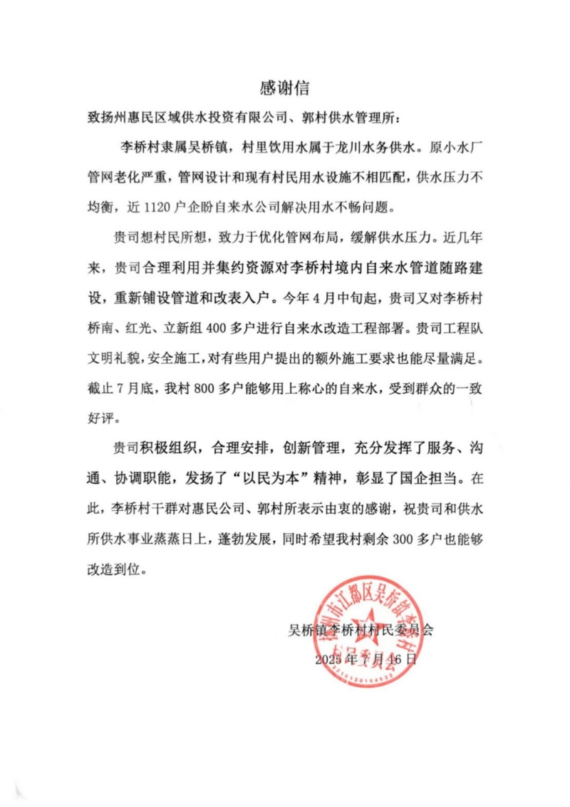 捧著這封沉甸甸的感謝信,惠民區(qū)域供水公司負(fù)責(zé)人蔣珀表示,收到這封感謝信既是肯定也是鞭策。目前李橋村自來(lái)水改造項(xiàng)目還在實(shí)施中,預(yù)計(jì)今年10月底竣工,改造工程完工后,李橋村的自來(lái)水供水能力和水質(zhì)將得到顯著提升,能夠徹底解決村民的用水“煩心事”,村民的認(rèn)可就是我們工作的最大動(dòng)力,保障群眾用上“放心水、滿意水”是我們的職責(zé)所在。今后,惠民區(qū)域供水公司將繼續(xù)聚焦群眾用水需求,不斷提升供水服務(wù)質(zhì)量,讓更多群眾享受到更為優(yōu)質(zhì)、便捷的供水服務(wù),讓更多村組享受到優(yōu)質(zhì)的供水服務(wù),把民生工程做到群眾心坎上。用實(shí)際行動(dòng)踐行“為民辦實(shí)事”的承諾。